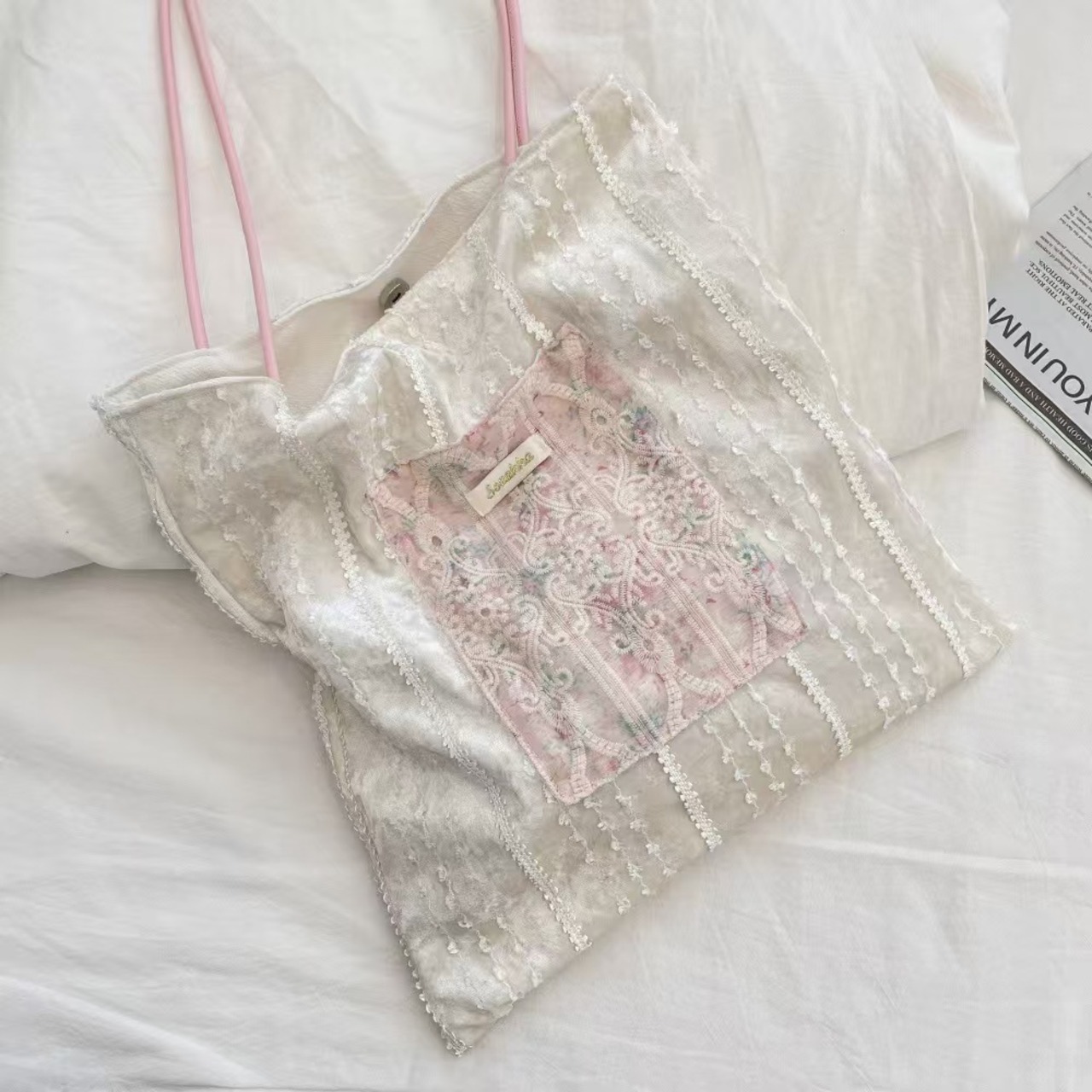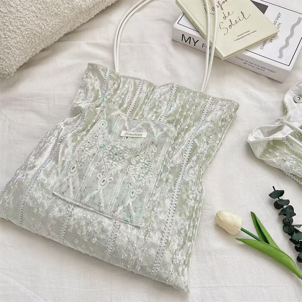 上品なパール光沢と繊細なレースを組み合わせた、小洒落感あふれるキャンバストートバッグ。