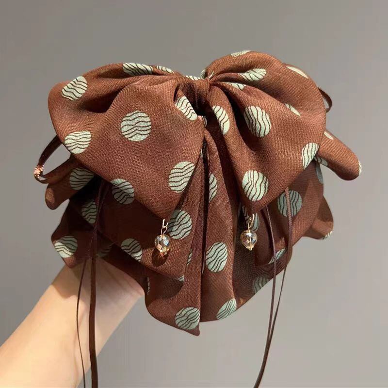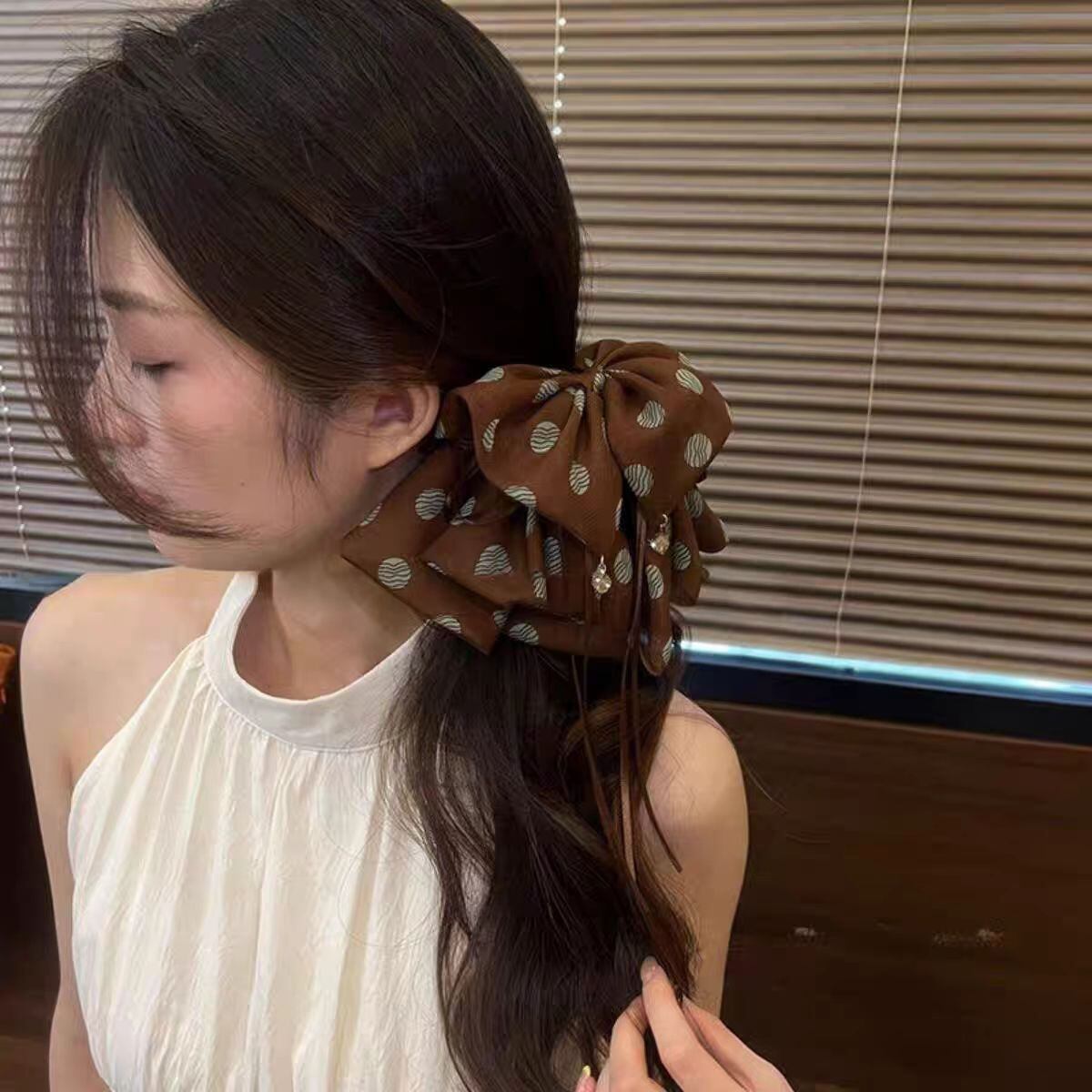 フレンチヴィンテージドットシフォンリボン付きクリップで、あなたの髪に華やかな彩りを添えましょう!