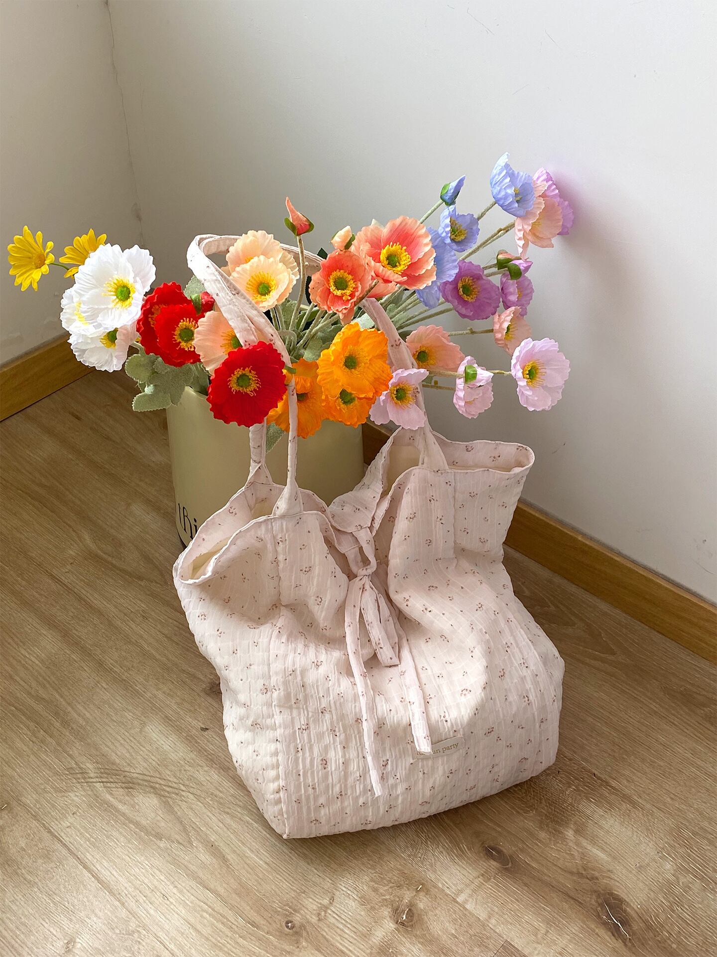 2025年夏の新作!甘く優雅な花柄が特徴のシフォン素材のトートバッグで、シンプルながらも上品なデザインが魅力的です。大容量で通勤や大学生活にもぴったりなこのバッグは、デイリーユースに便利なアイテム。