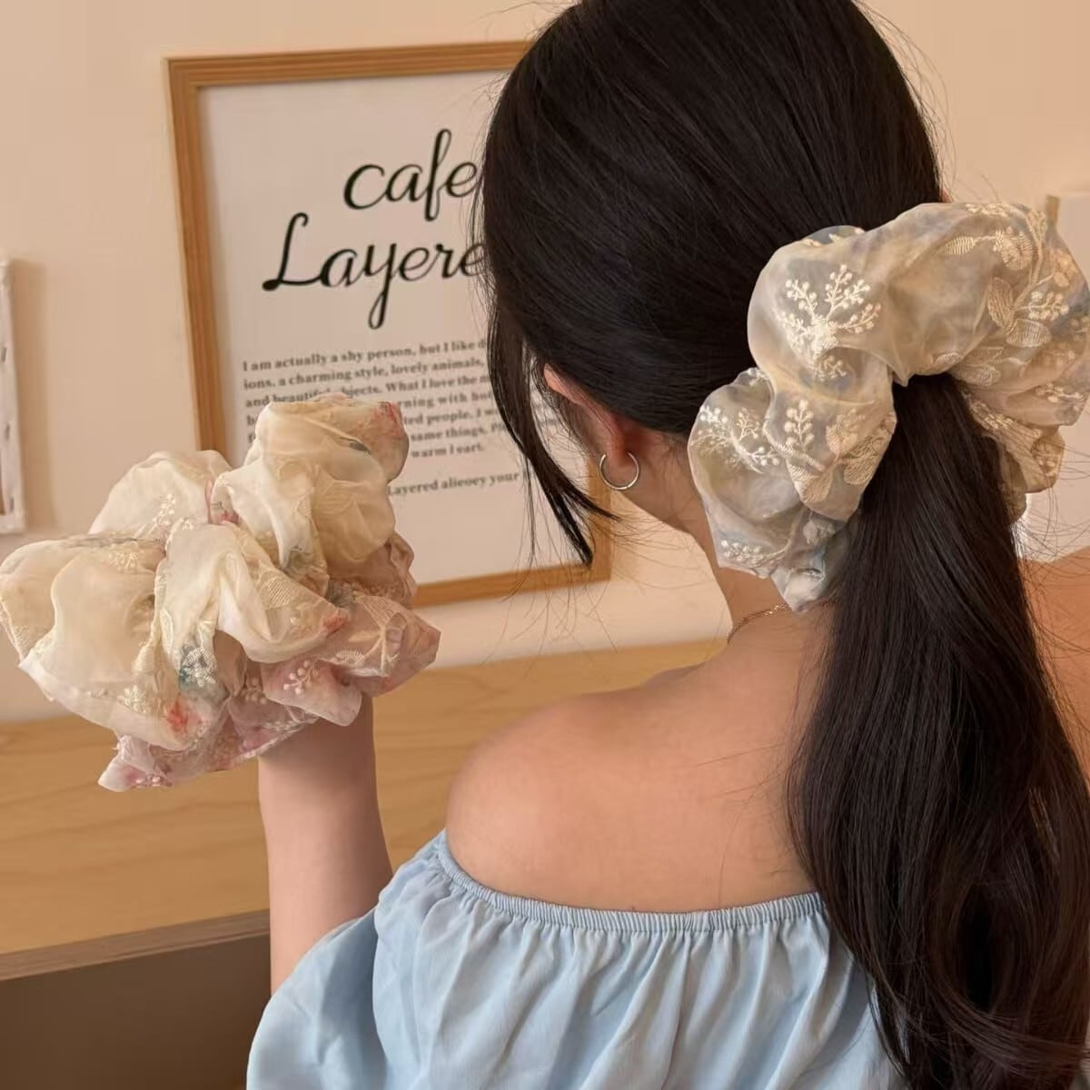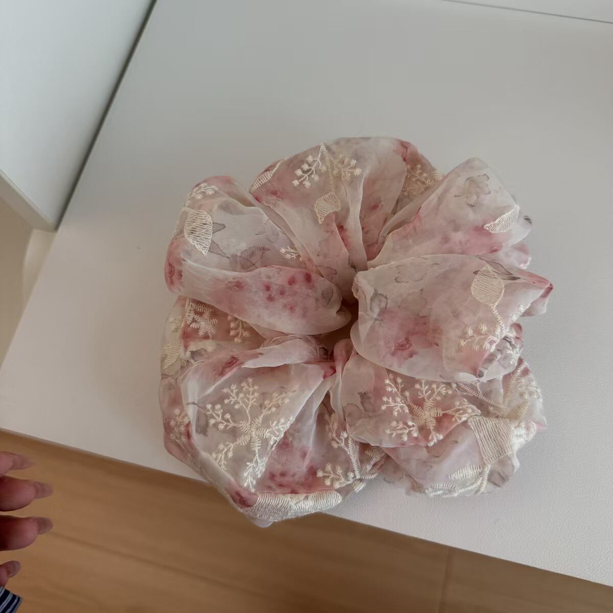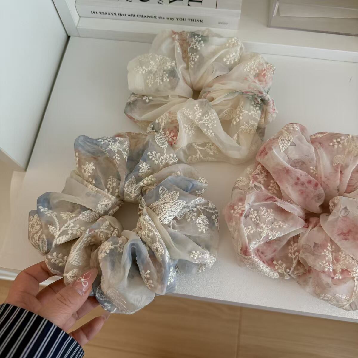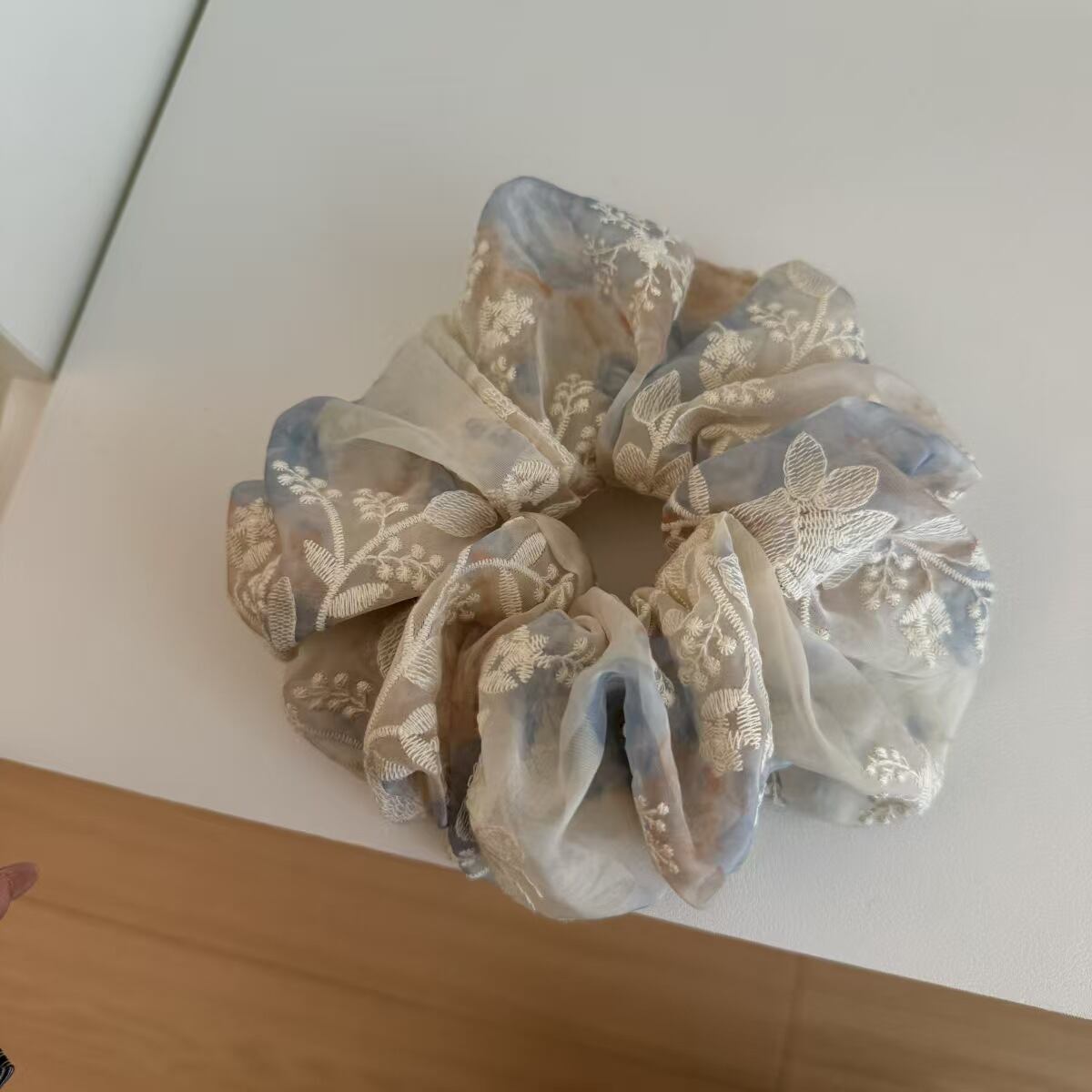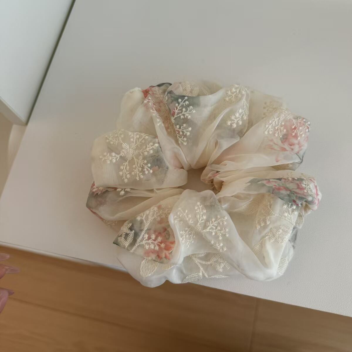 フランス風メッシュ刺繍立体小花シュシュ 上品で清新な高級感のあるヘアアクセサリー
