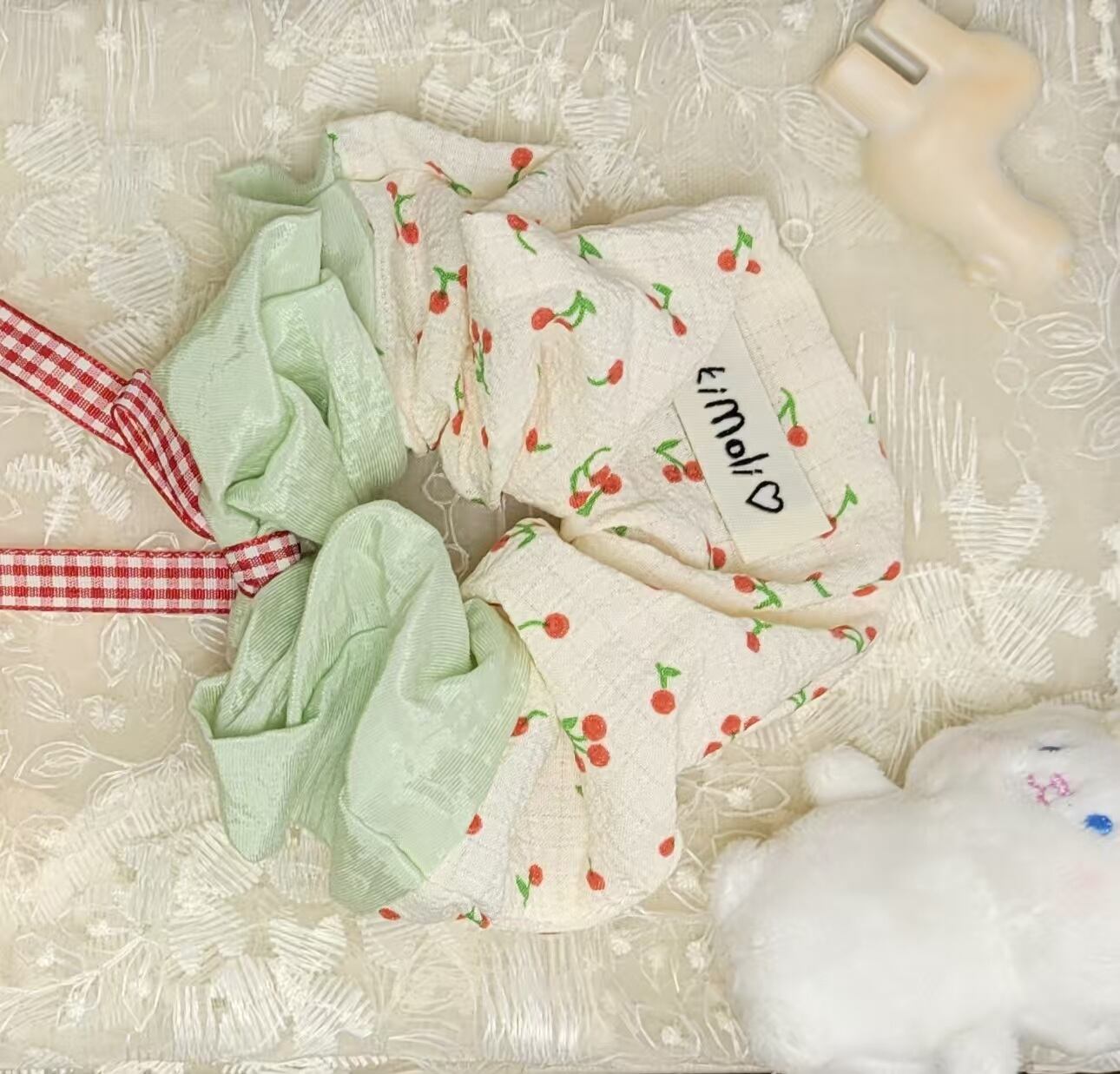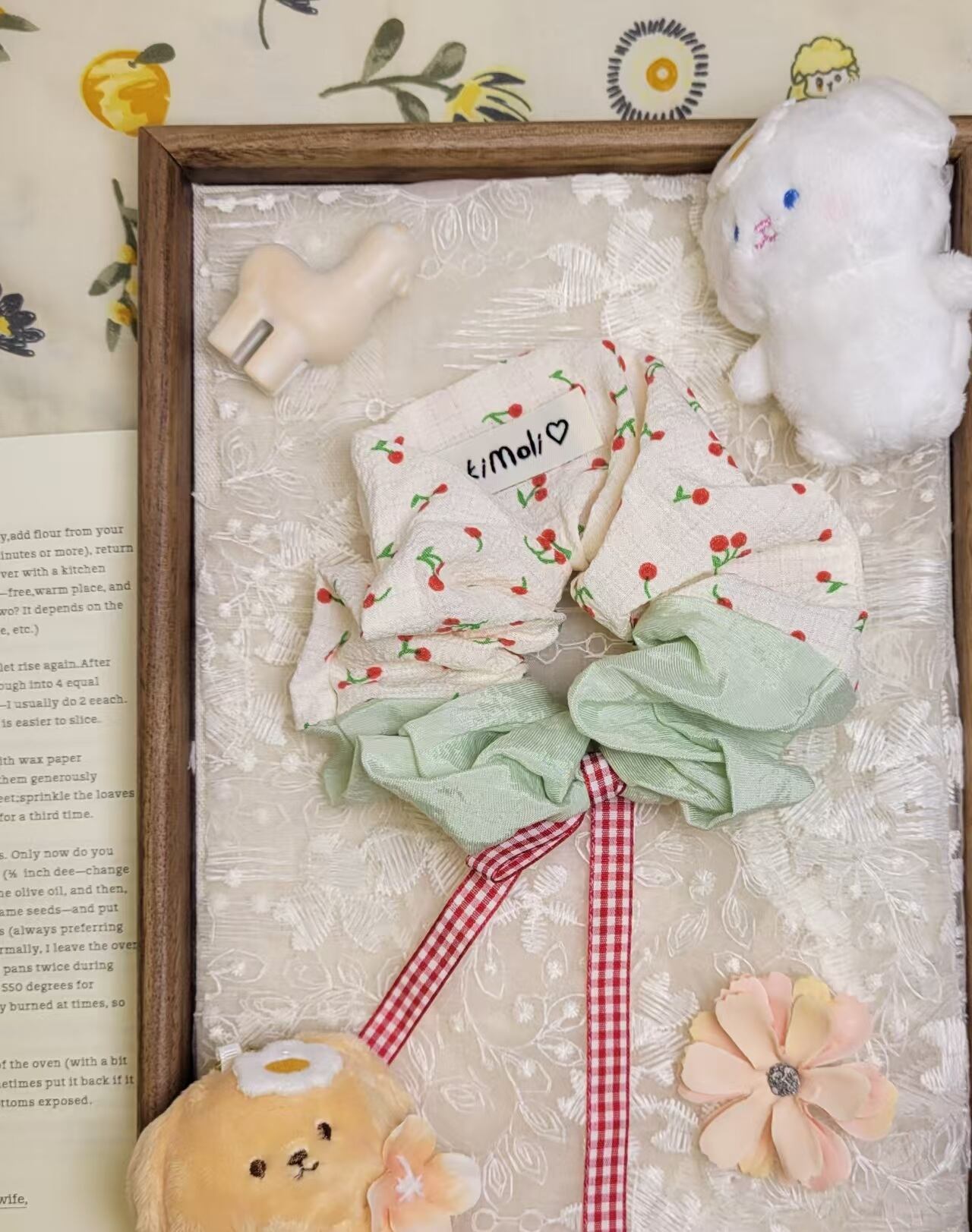 韓国系トレンドを取り入れた、バイカラー配色が目を引くチェリーモチーフのリボン付きヘアゴム。