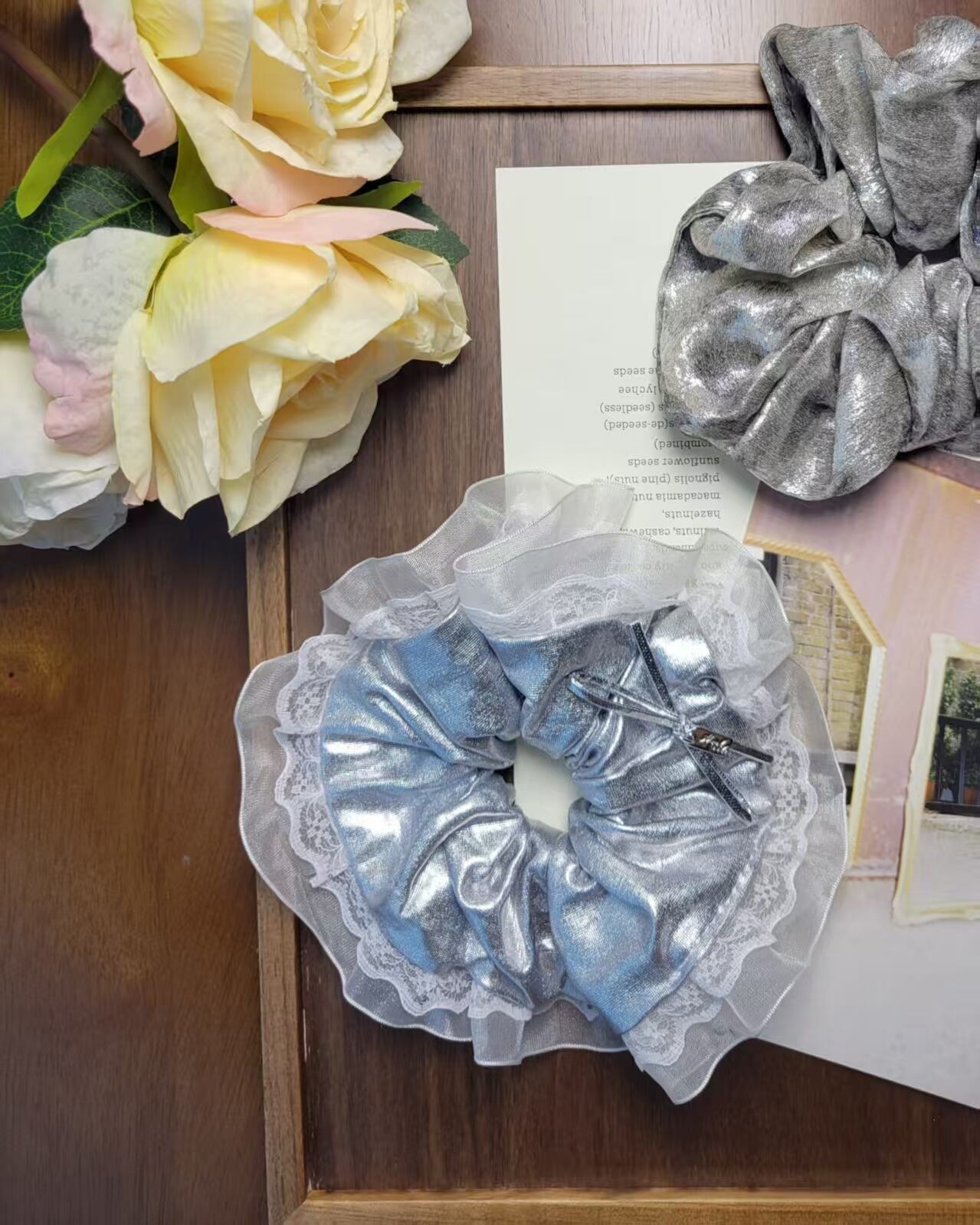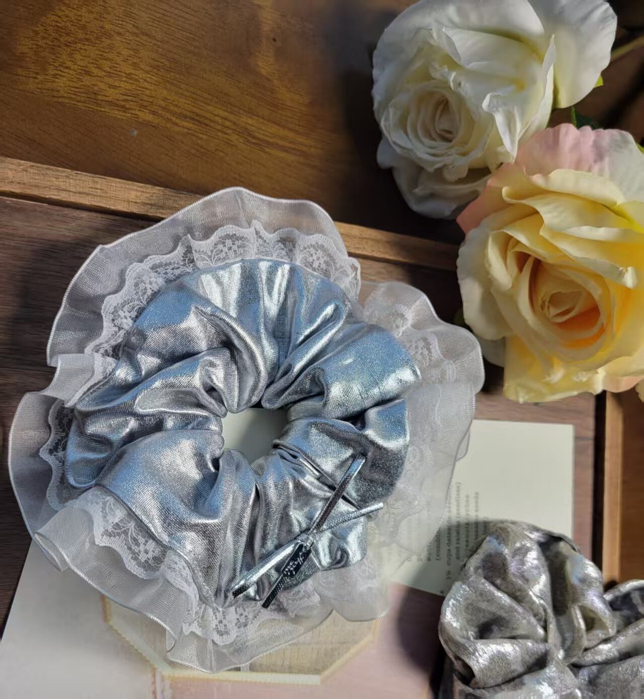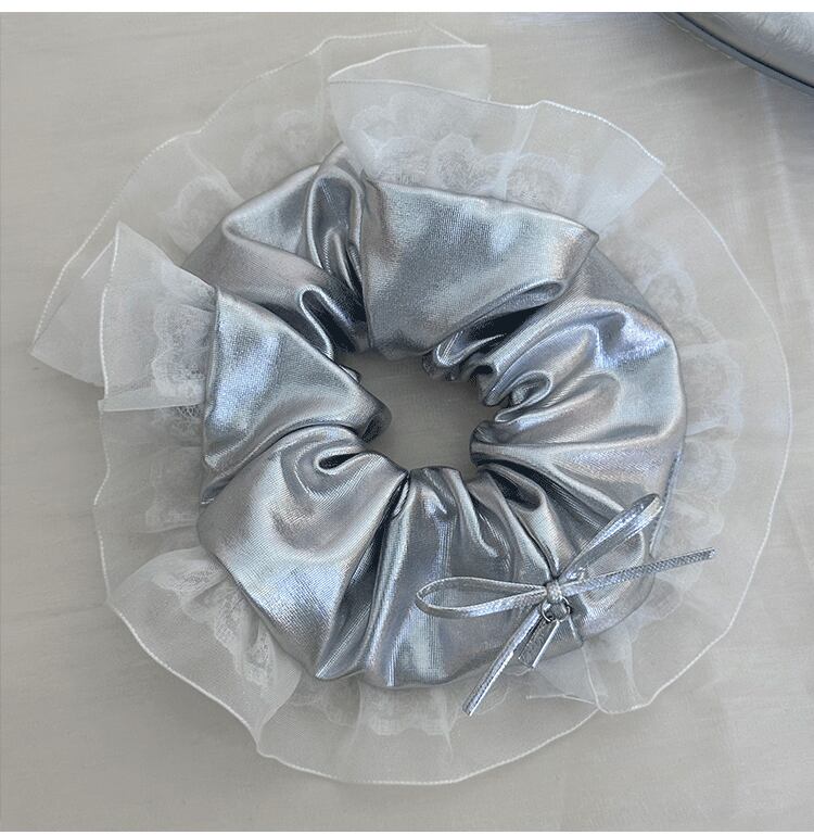 韓国風 シルバーバタフライレースシュシュ (PU素材・高弾力)
