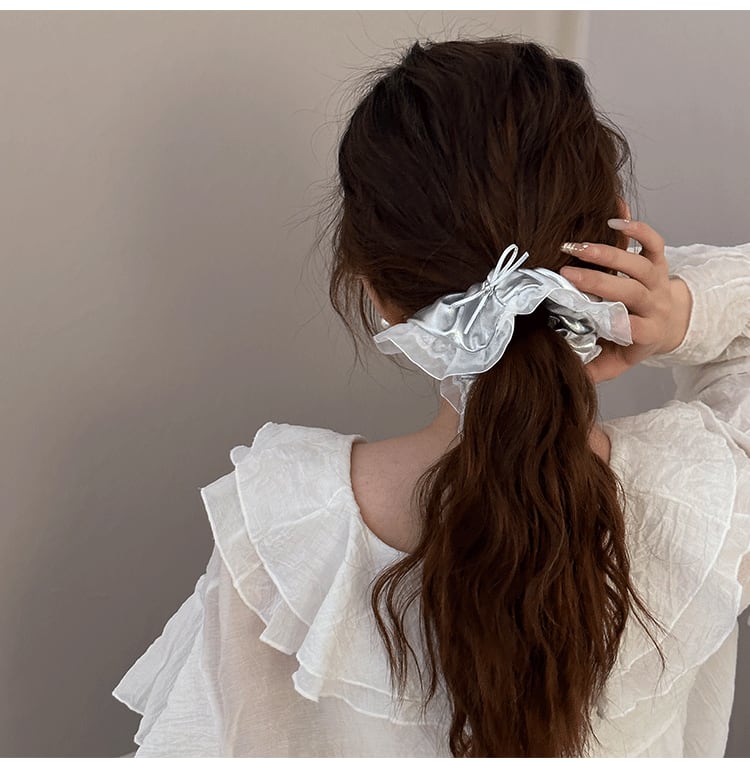 シンプルなデザインながら、シルバーの蝶結びとレースが絶妙に組み合わさることで、目を引くアクセントに。カジュアルからエレガントなスタイルまで、どんなコーディネートにも合わせやすい万能アイテムです。髪型をしっかりとまとめるだけでなく、洗練された印象を与え、日常使いにぴったり。