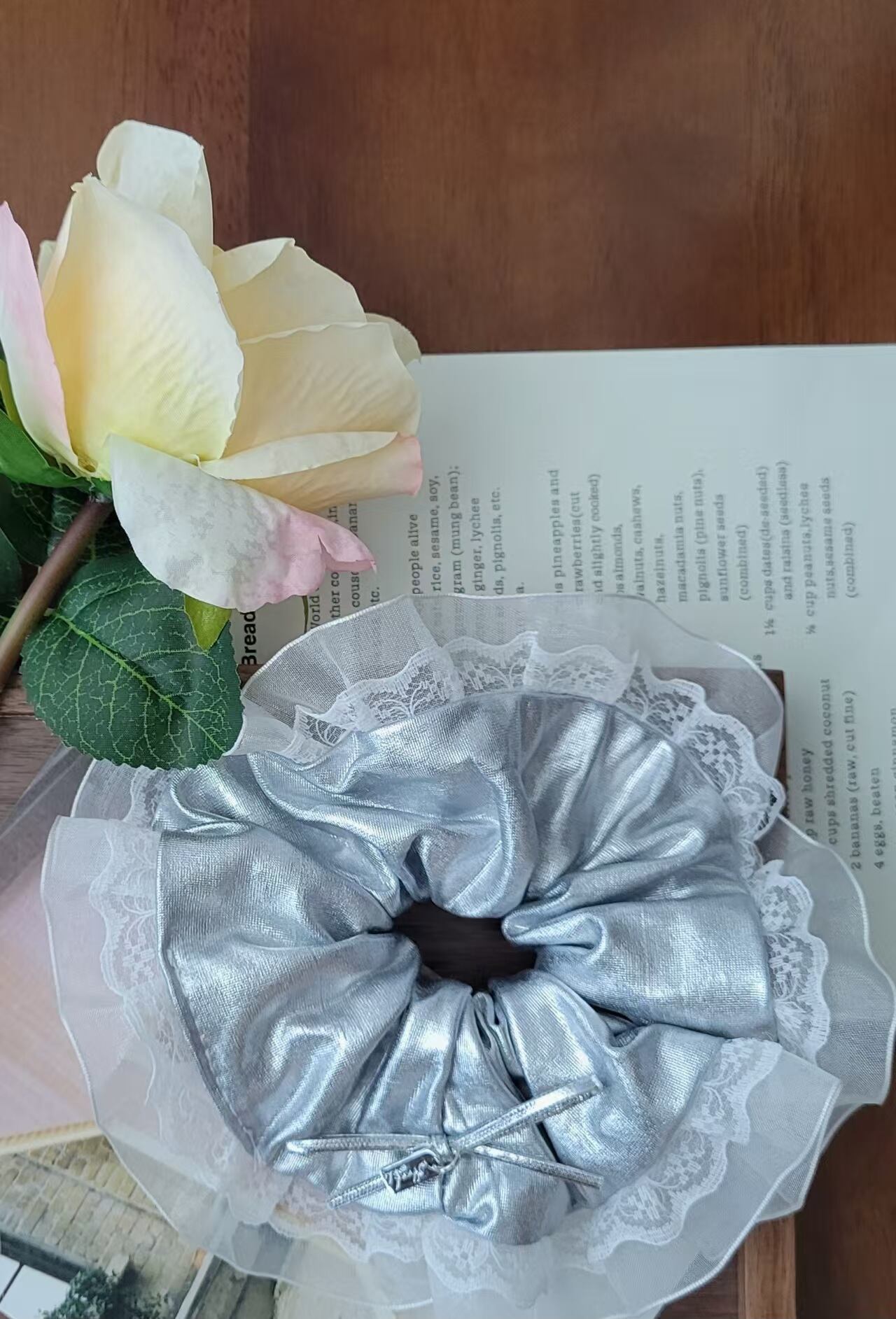 このシルバーの蝶結びが華やかに装飾されたヘアゴムは、韓国風のおしゃれで上品なデザインが特徴です。