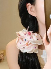 リボンのボリューム感やフリルのデザインが、普段のコーディネートに特別なアクセントを加え、カジュアルなお出かけやパーティーシーンまで、幅広く活躍することが期待できます。このシュシュを使うことで、女性らしさを強調し、遊び心のあるおしゃれを楽しむことができます。