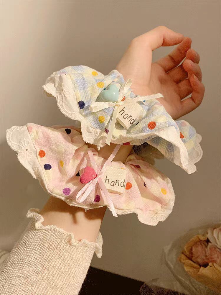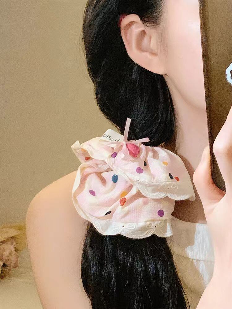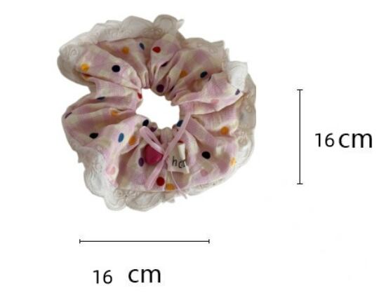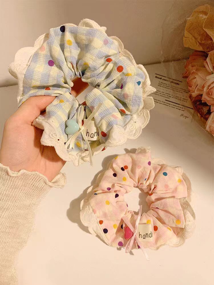 カラフルドットチェックリボンシュシュ レースフリルヘアアクセサリー