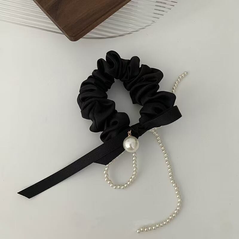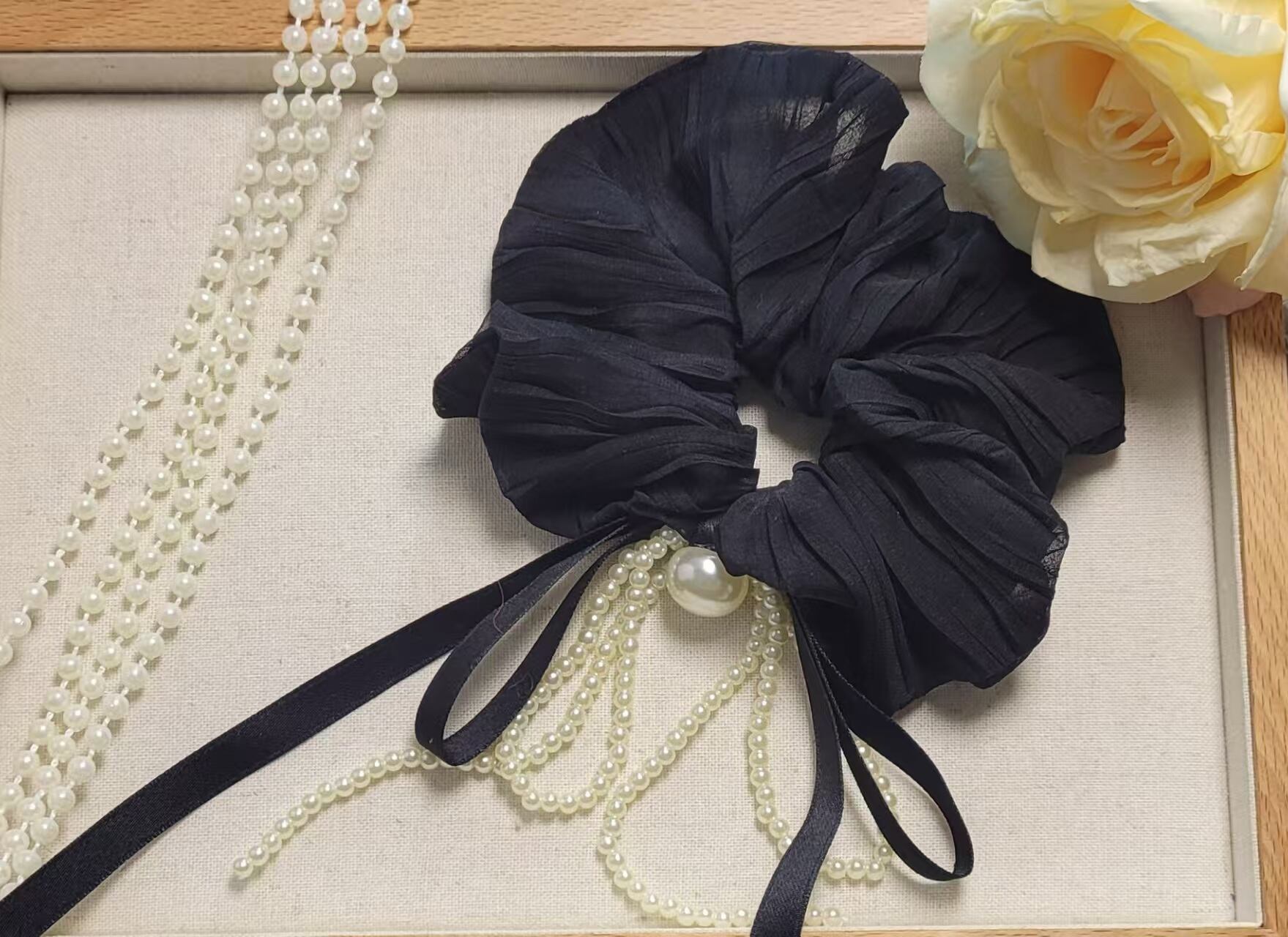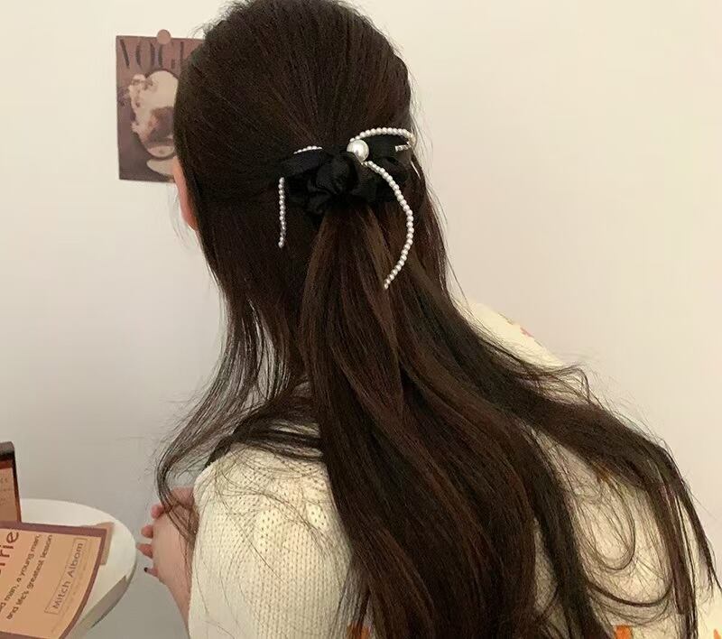 フレンチリボンの上品な素材感とパールの輝きが、あなたの髪を一層引き立てます。高弾力の素材を使用しているため、髪をしっかりとまとめながらも、自然なボリューム感を演出できます。