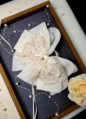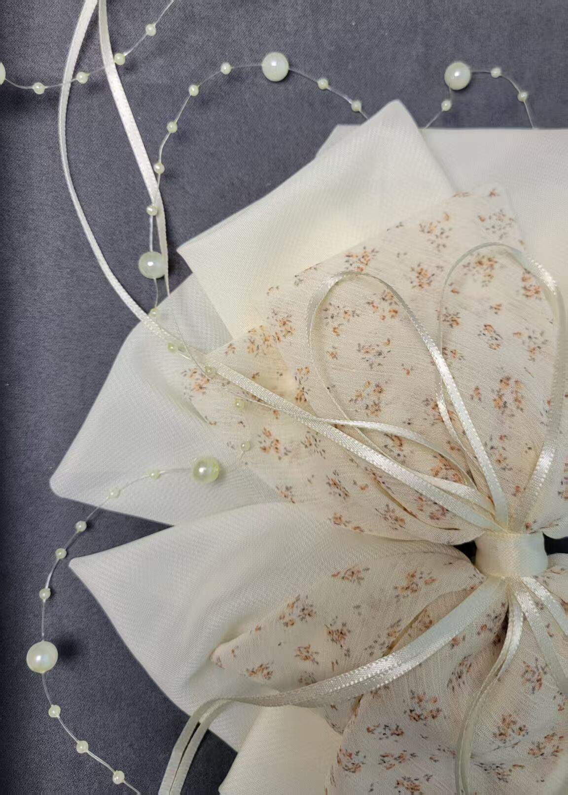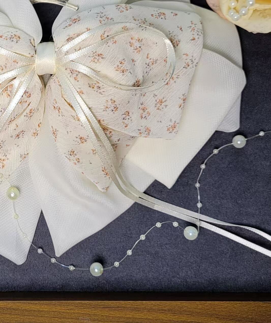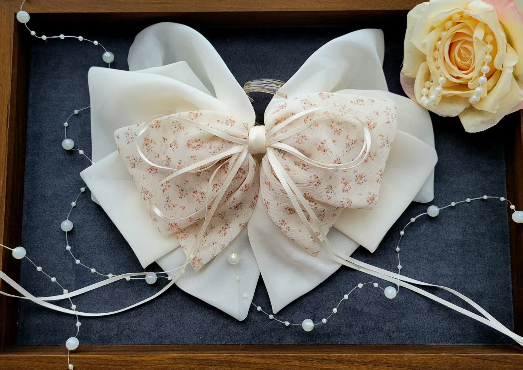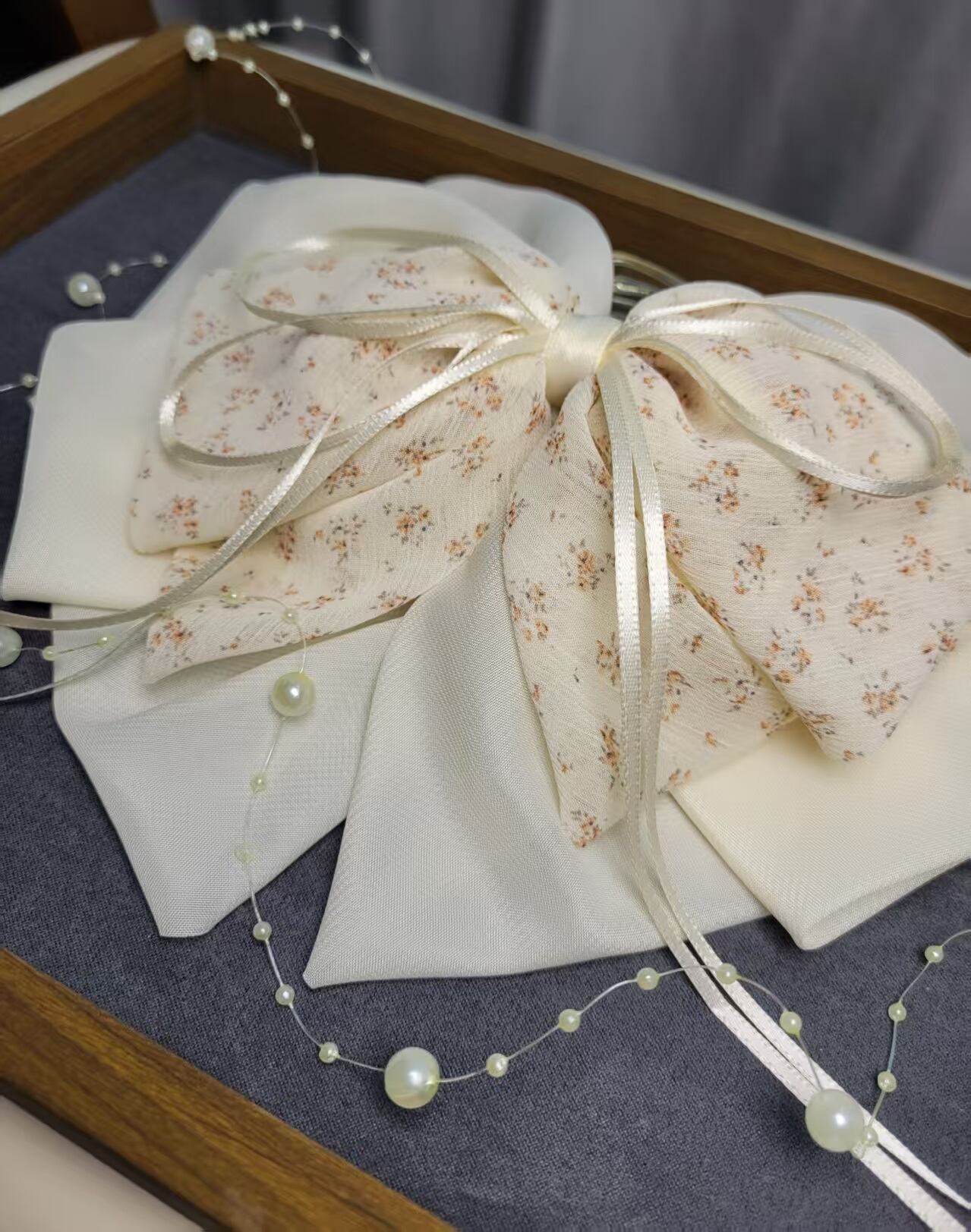 柔らかなシルク素材に大きめのフラワーリボンが施され、後ろ姿に華やかさとかわいらしさを添えるデザインが魅力です。