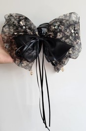 フラワーリボンは、繊細なデザインとともに質感の異なる素材が組み合わさり、上品な印象を演出します。さらに、リボンの底部にはクリスタルが輝き、後ろ姿に華やかさをプラスするのが魅力です。