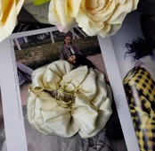 シフォン素材のリボンは、柔らかい質感と軽やかな動きが特徴で、上品な印象を演出します。輝きを放つビジューがリボンに添えられ、後ろ姿を華やかに飾るのが魅力です。