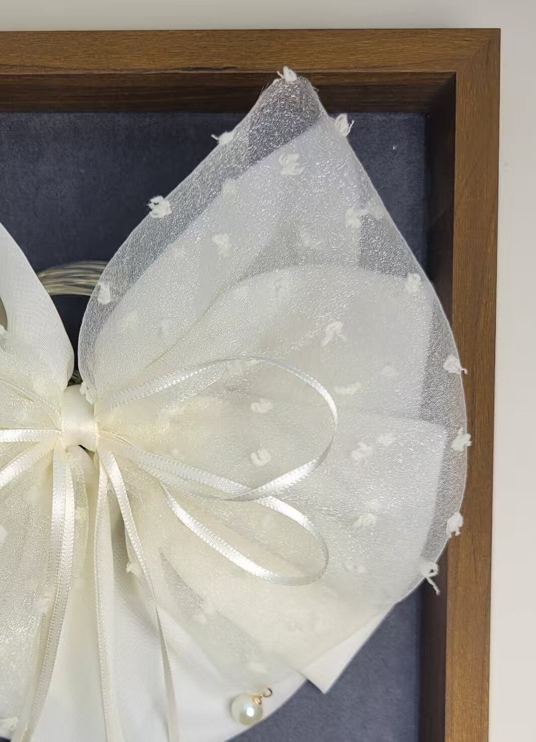 ドット柄のリボンと柔らかなチュール素材が絶妙に組み合わさり、上品でありながらもカジュアルな印象を演出します。さらに、リボンのデザインには輝くパールが添えられており、後ろ姿に華やかさをプラスするのが魅力です。