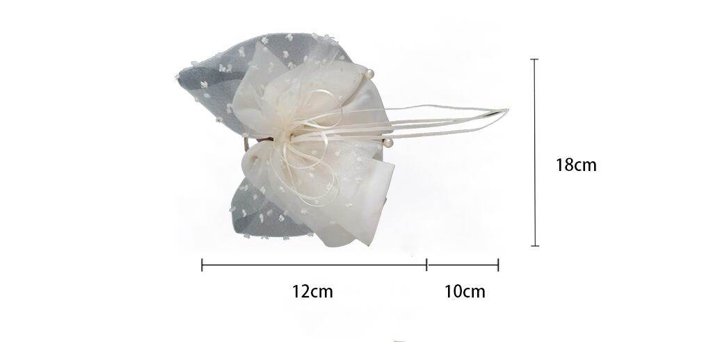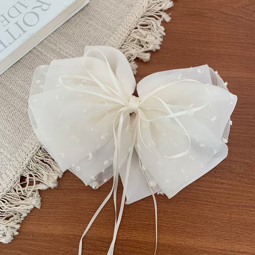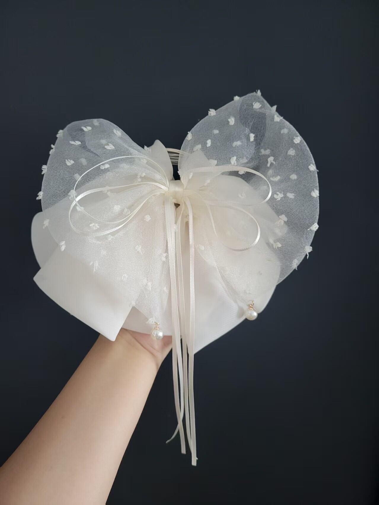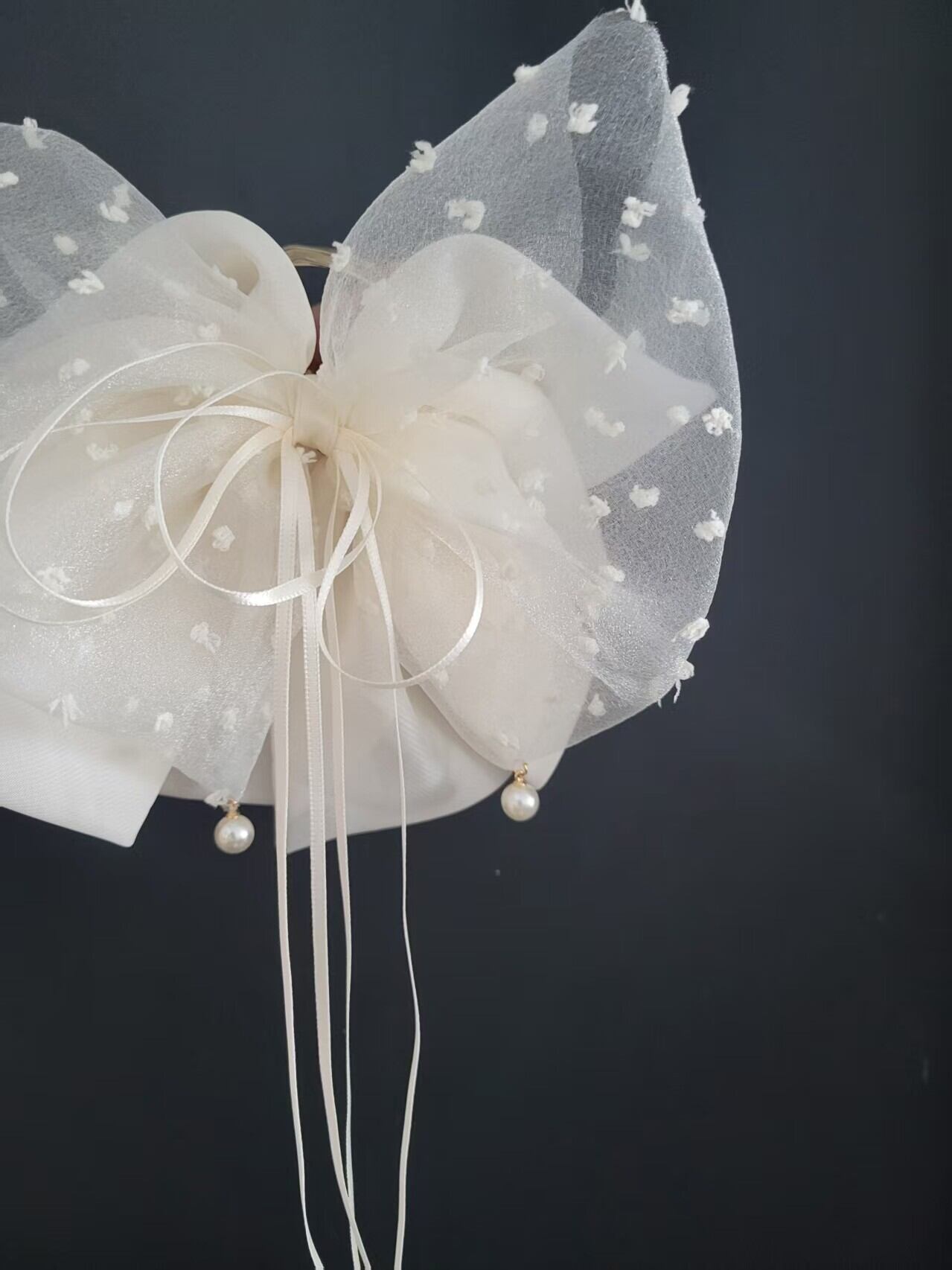 韓国風 ドットリボン&パール付きチュールバンスクリップ