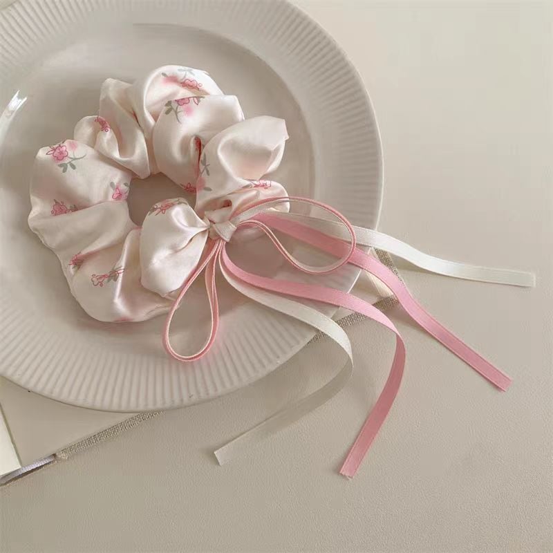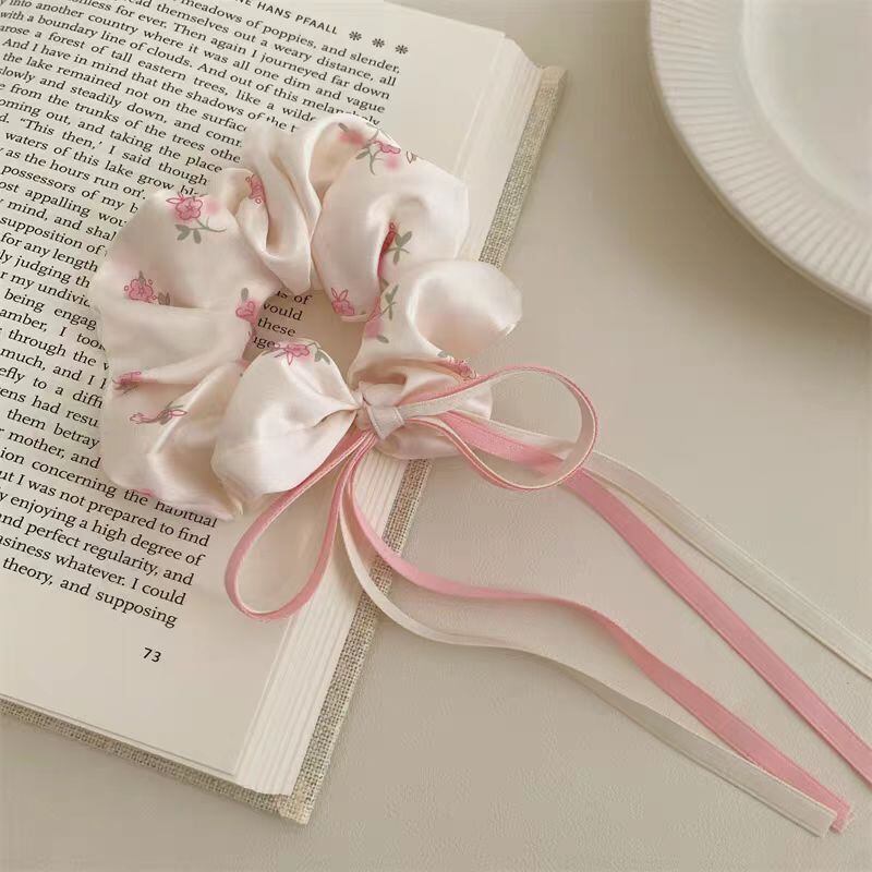 バレエ風フローラルリボン付きシュシュ シルキーリボン×ロングテール 大人可愛いヘアアクセ