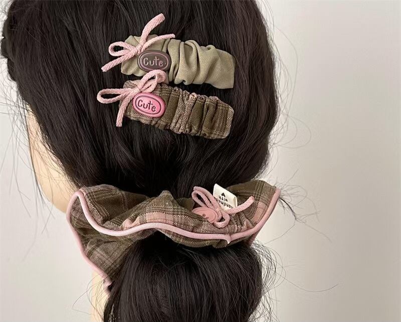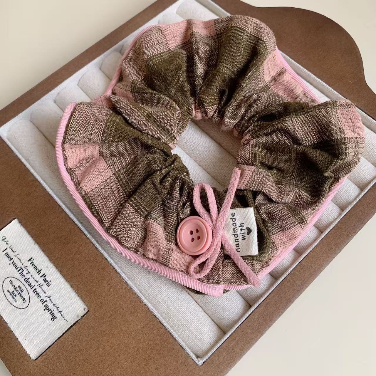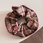 レトロチェック柄リボン×ボタン付きシュシュ ピンクブラウン 大人ガーリーヘアアクセ