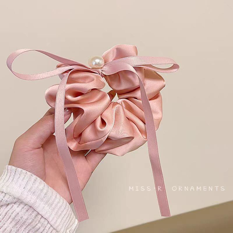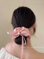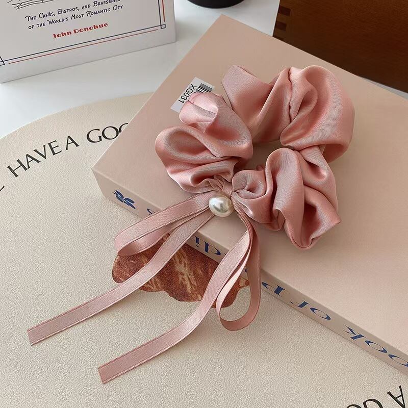 柔らかなピンクカラーのシュシュに、ロマンティックなリボンをプラスしたフェミニンなデザイン。