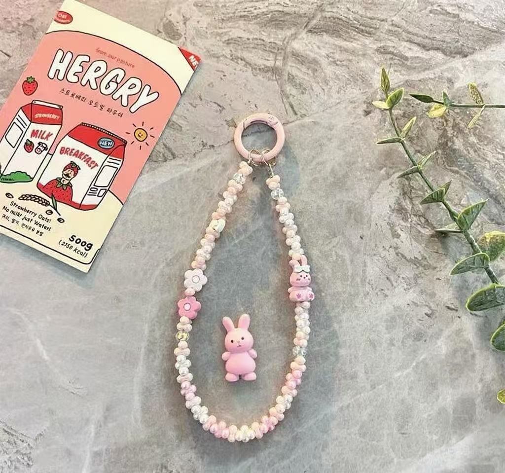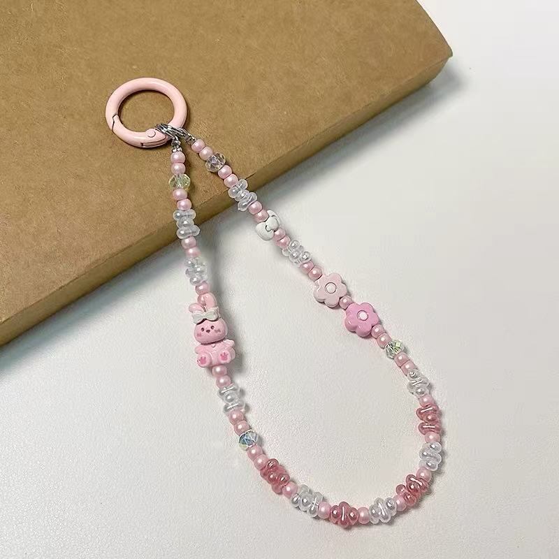 柔らかい色合いのビーズで作られた可愛らしい花と、ぽちゃっとしたうさぎのデザインが組み合わさり、見るだけで幸せな気分になれます。