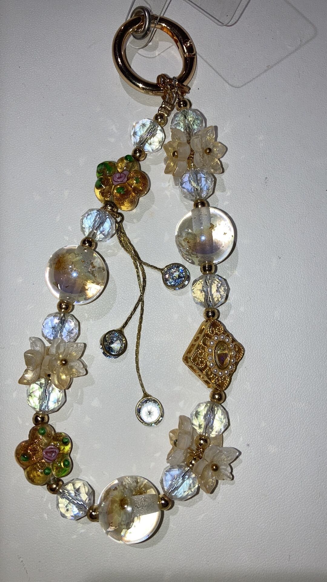 クリスタル&フラワーチャーム付き ゴールドキーホルダー