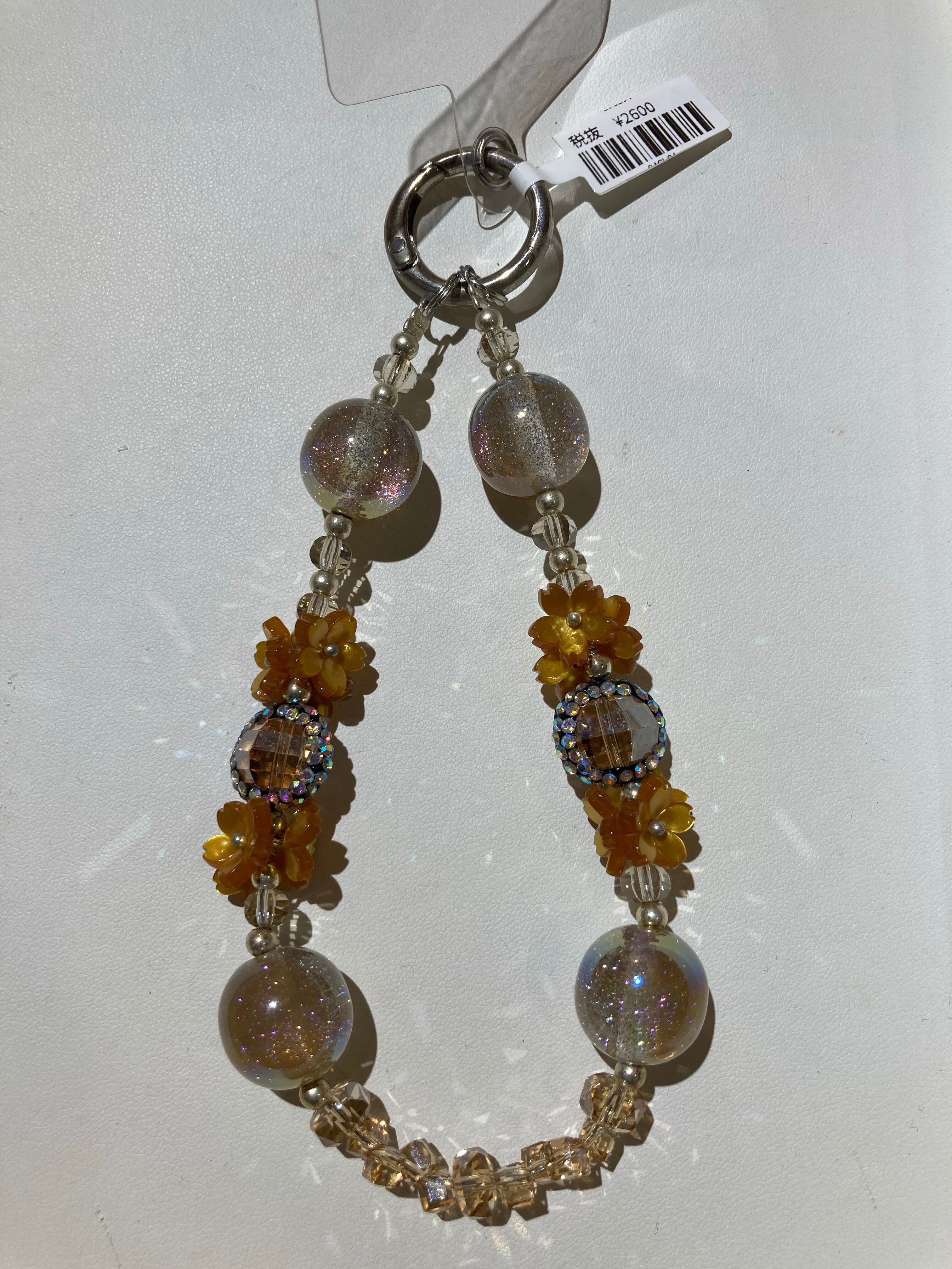 黄色の花モチーフや、ビーズの周りにあしらわれた細かい装飾が、華やかさと精緻さをプラス。底部の小さなクリスタルビーズが立体感を演出し、全体に美しい層次感を生み出します。バッグやスマホに付けるだけで、日常のコーディネートを華やかに彩るアイテムです。