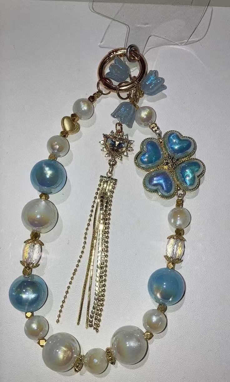 ブルーのクローバーデザインに、揺れるフリンジと光沢のあるパールを組み合わせ、動くたびに優雅な雰囲気を放ちます。