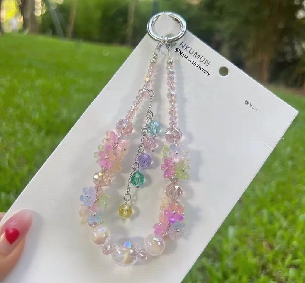 ピンク、ブルー、イエローなどの明るいカラーフリンジが揺れるたびに、光を反射するクリスタルと共に華やかな雰囲気を演出します。