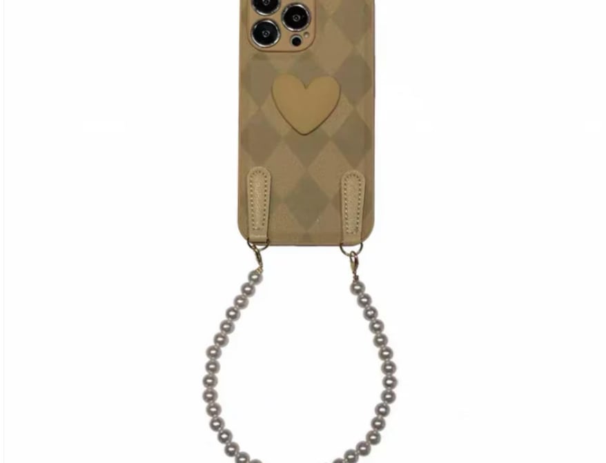ダイヤモンドパターンとハート柄が施されたブラウン色のスマホケース(iPhone15ProMax)