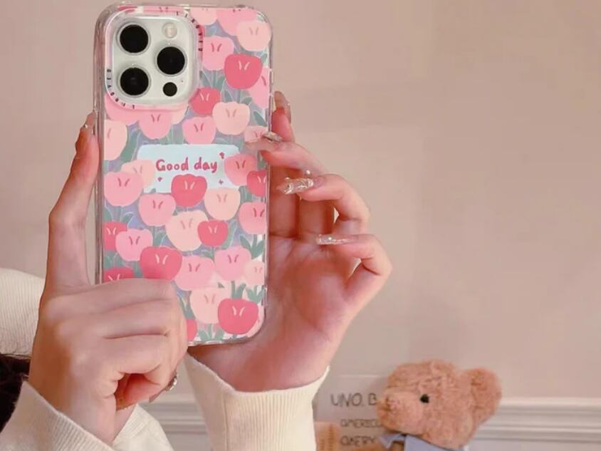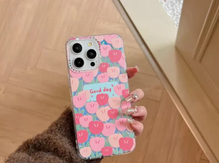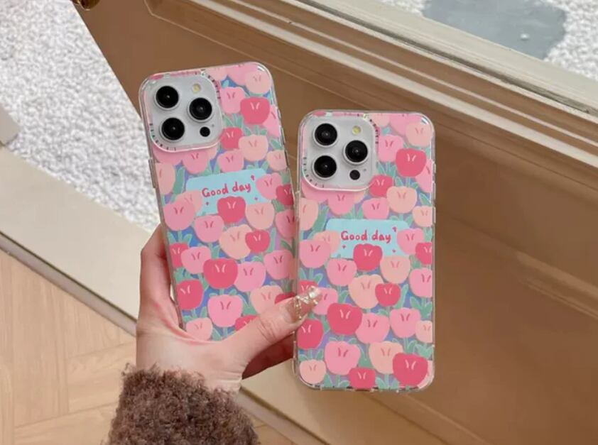 素敵な一日をテーマにした、ピンクのチューリップ柄が可愛らしいスマホケースです。