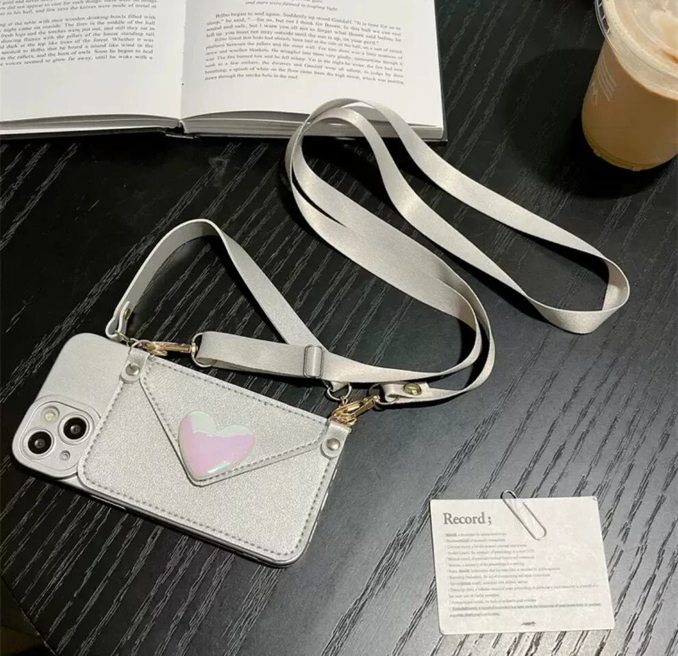 このスマホケースの本体はシリコーン素材で作られており、メッキ加工されたハート形の装飾と紐が付いており、耐久性と美観を兼ね備えています 。