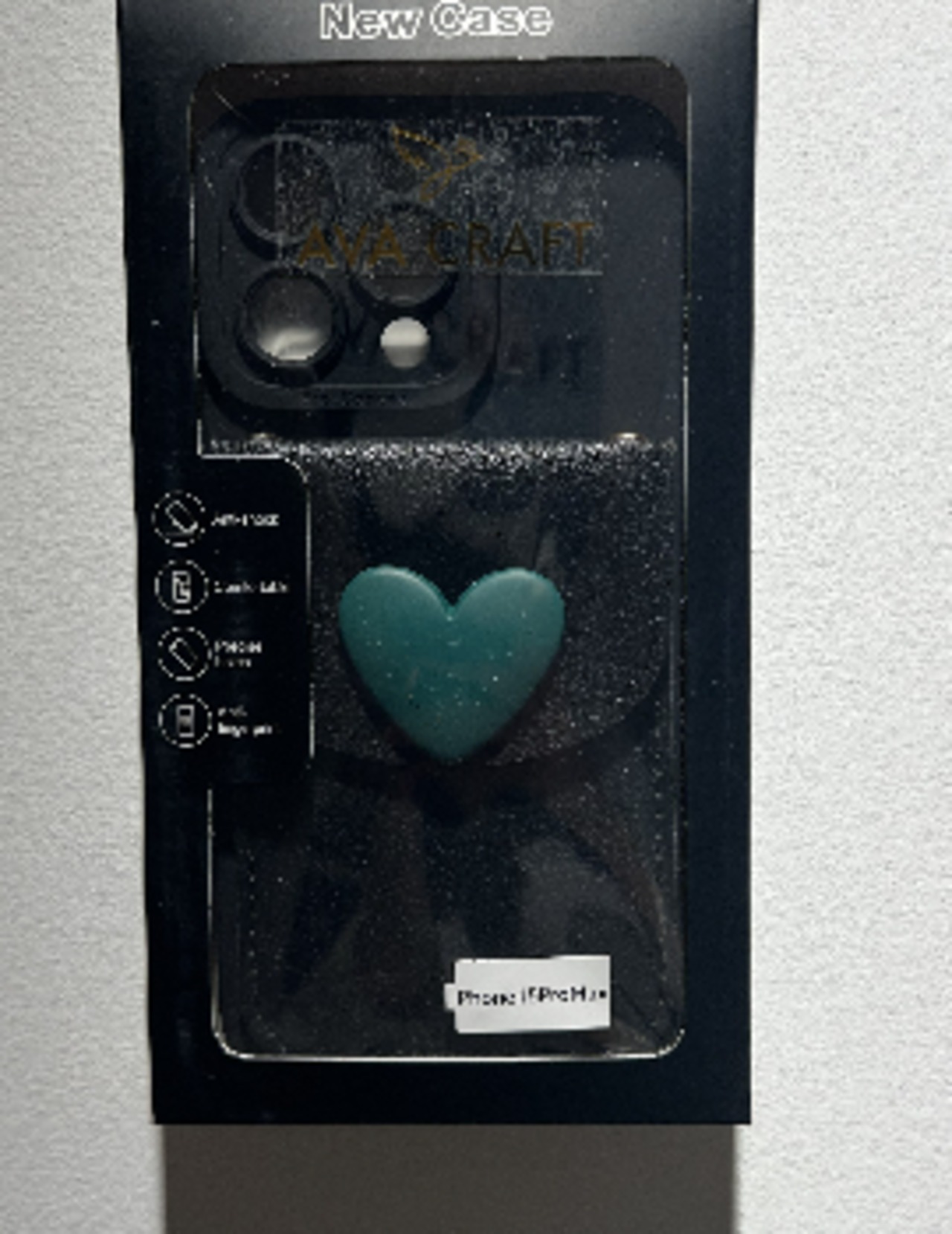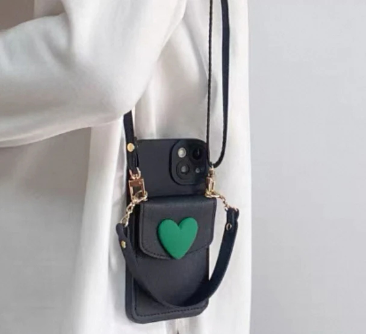 このスマホケースの本体はソフトゴム素材で作られており、緑色のハートデザインが施され、カード入れ機能も備えており、保護機能と実用性を兼ね備えています。