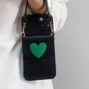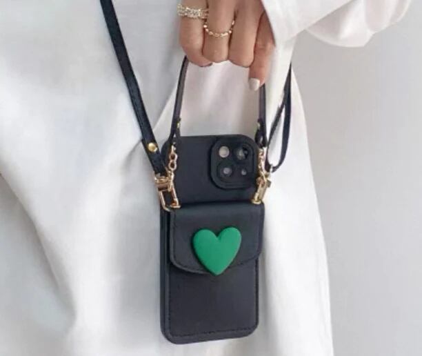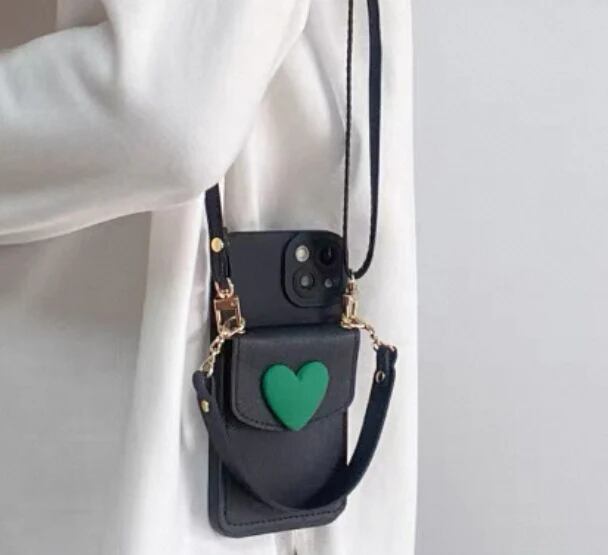 緑色のハートデザインで、カード入れポケット付きのスマホケース