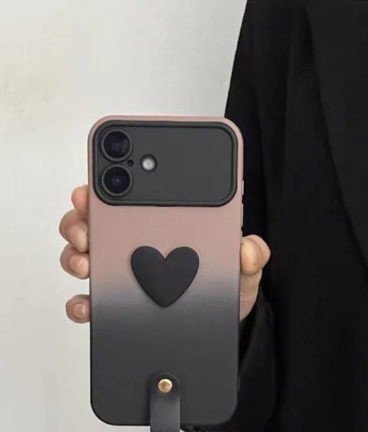 ピンクと黒のコントラストカラーで、ハートデザインのスマホケース