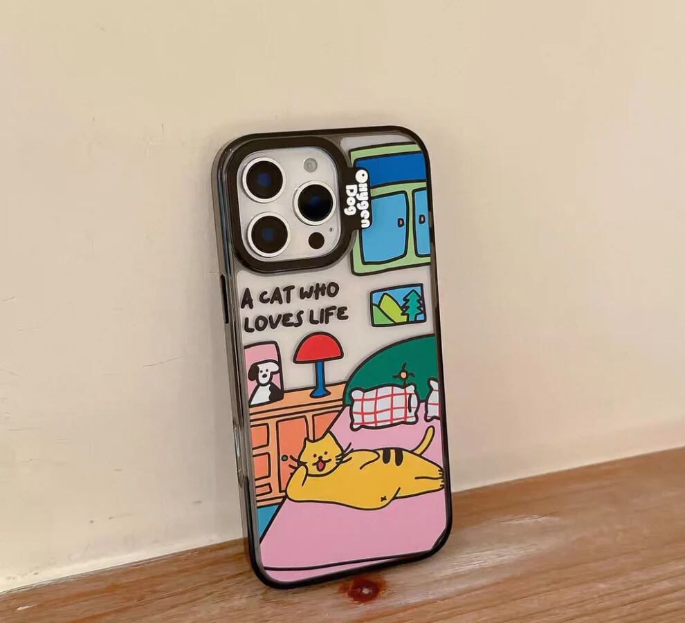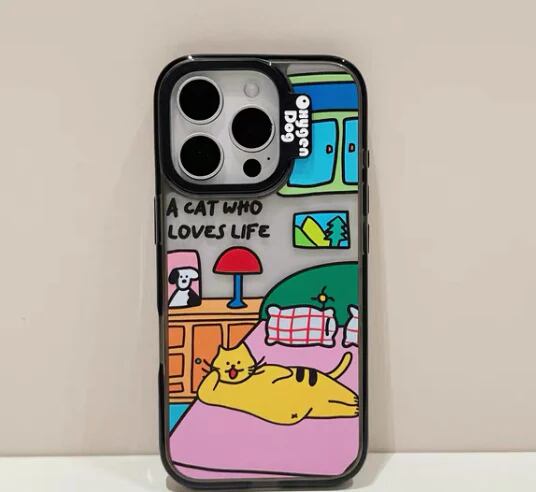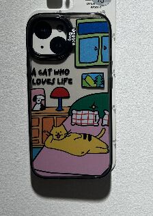 カートゥーンのソファ猫デザインで、汚れに強いスマホケース