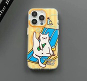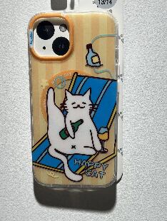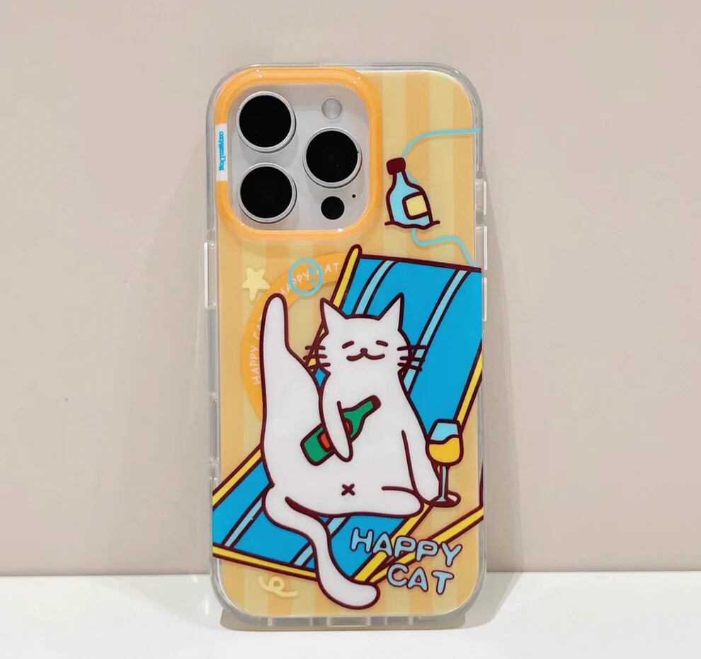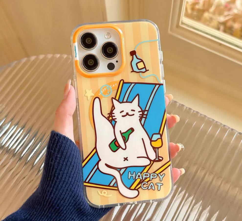 幸せそうな猫が休暇を楽しむ、可愛いスタイルのスマホケース(iPhone13/14)