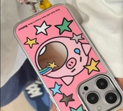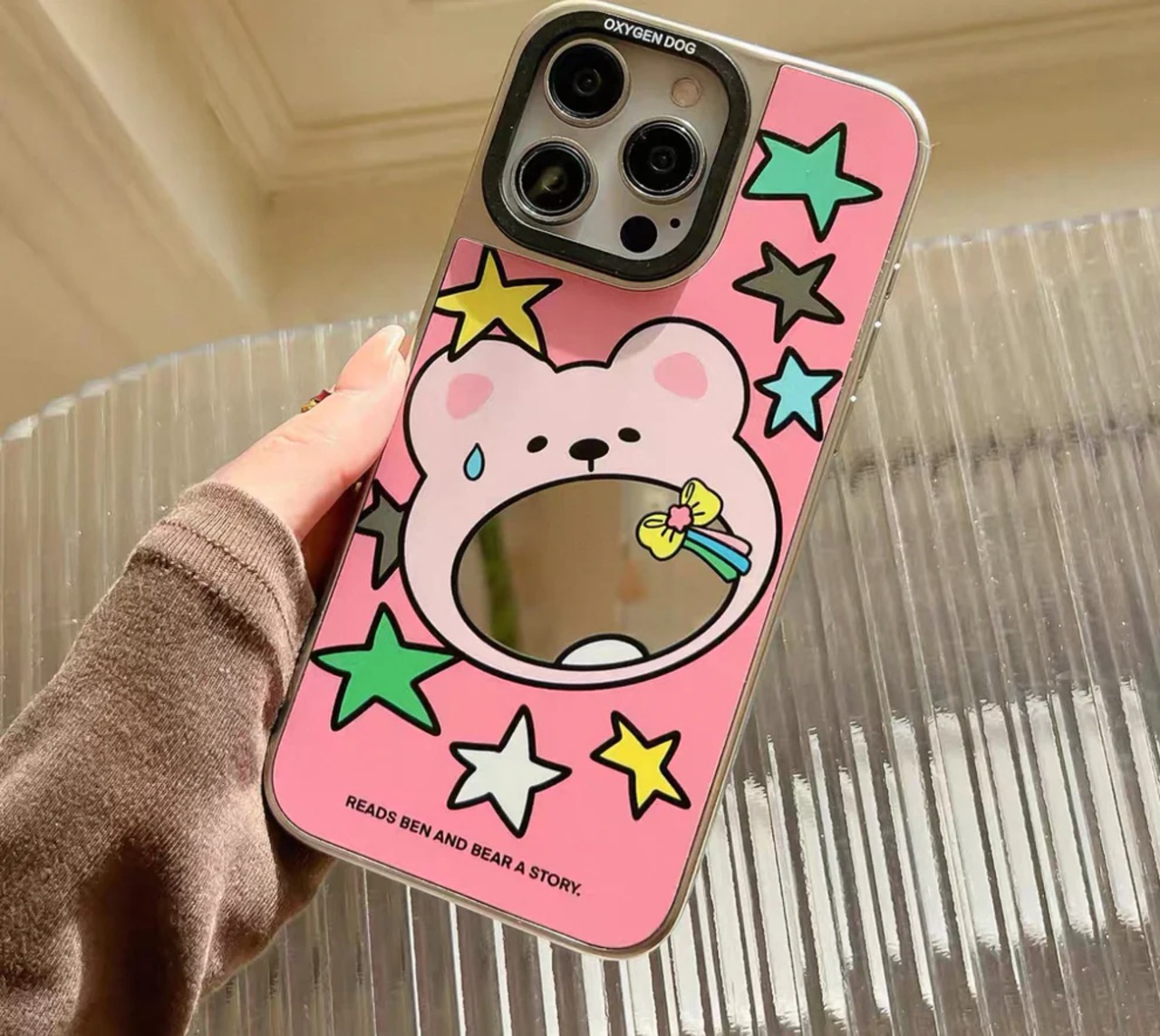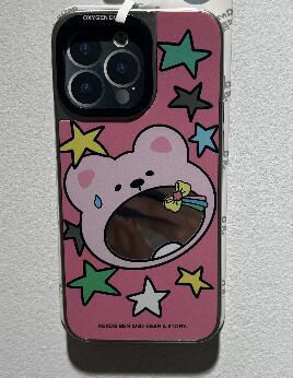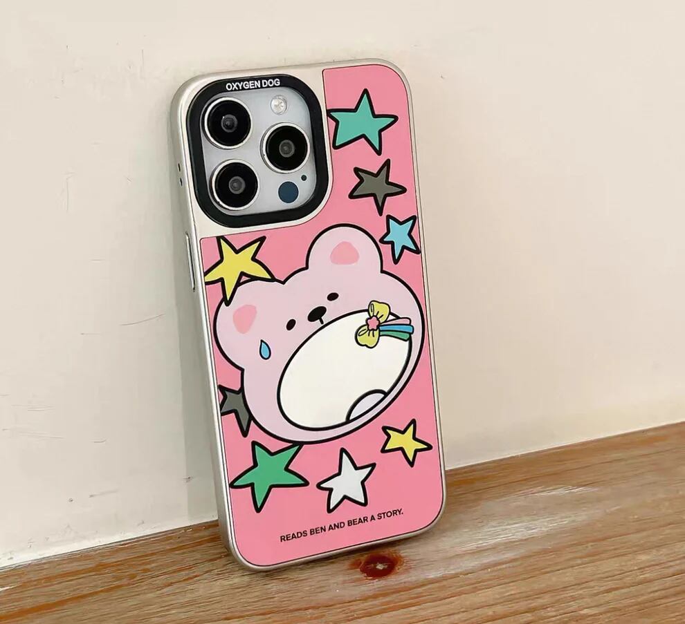 ファンデーション色の星と小熊がデザインされ、鏡面仕上げのスマホケース