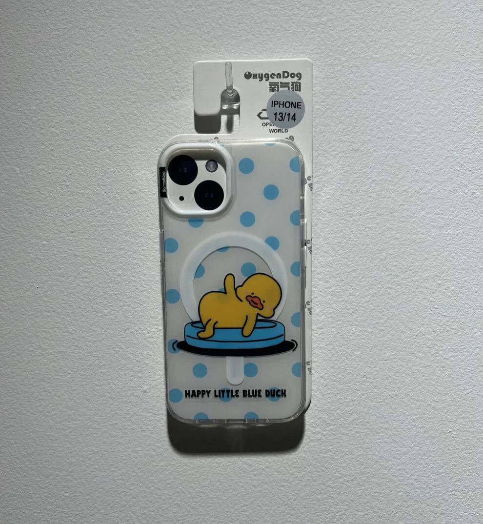 このスマホケースのフレームは透明な硬質素材でできており、本体部分には小黄鴨のデザインが施されています。硬質素材により、耐衝撃性を備えており、長期的な使用にも対応可能です。