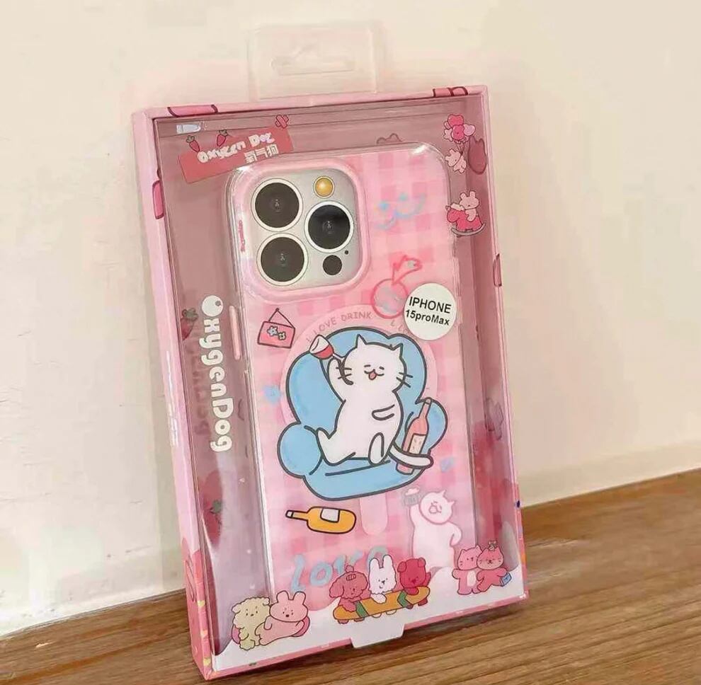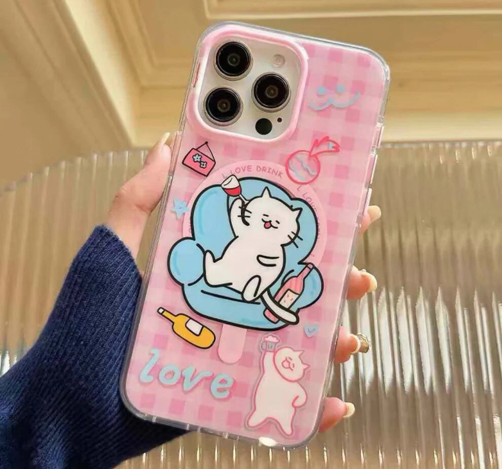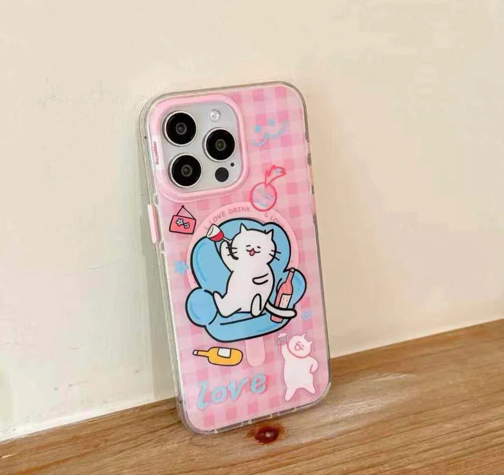 オリジナルの酔ったネコのデザインで、磁石付きのフルカバーカートゥーンスマホケース(iPhone13/14)